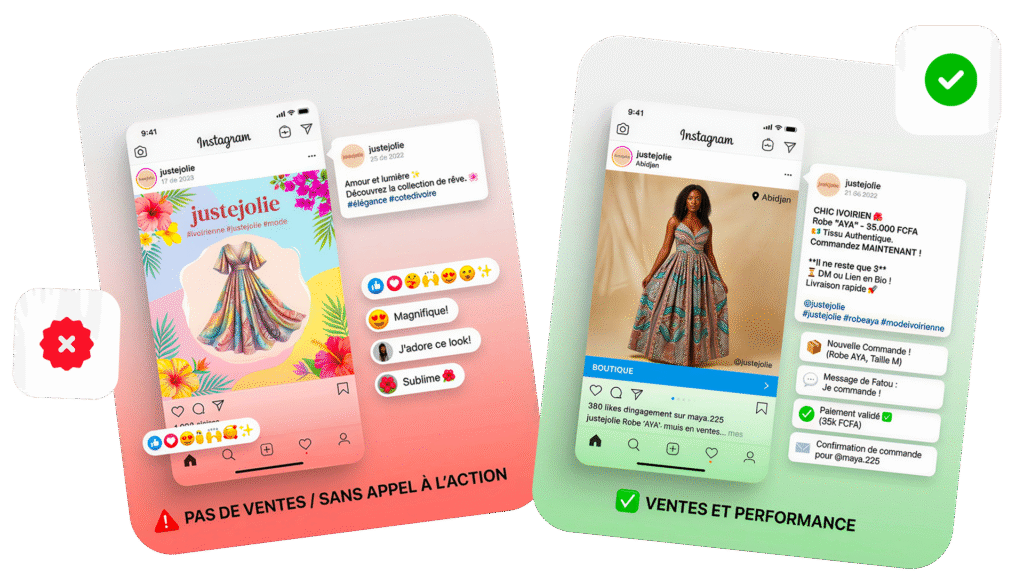 Pas "est-ce que c'est beau ?" Mais "est-ce que ça vend ?" Un visuel peut recevoir 1000 likes et ne générer aucune vente. Un visuel peut être sobre, direct, sans fioriture et remplir ton carnet de commandes. La différence ? L'intention derrière.
